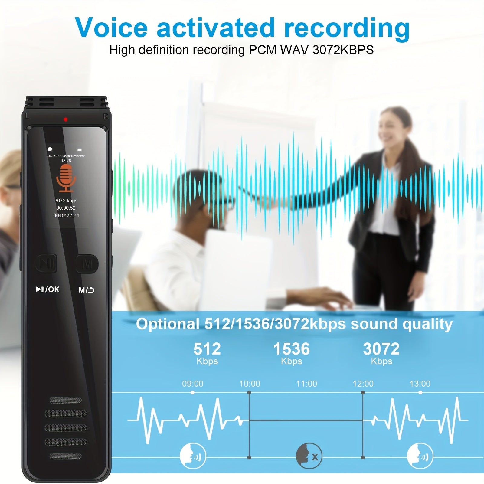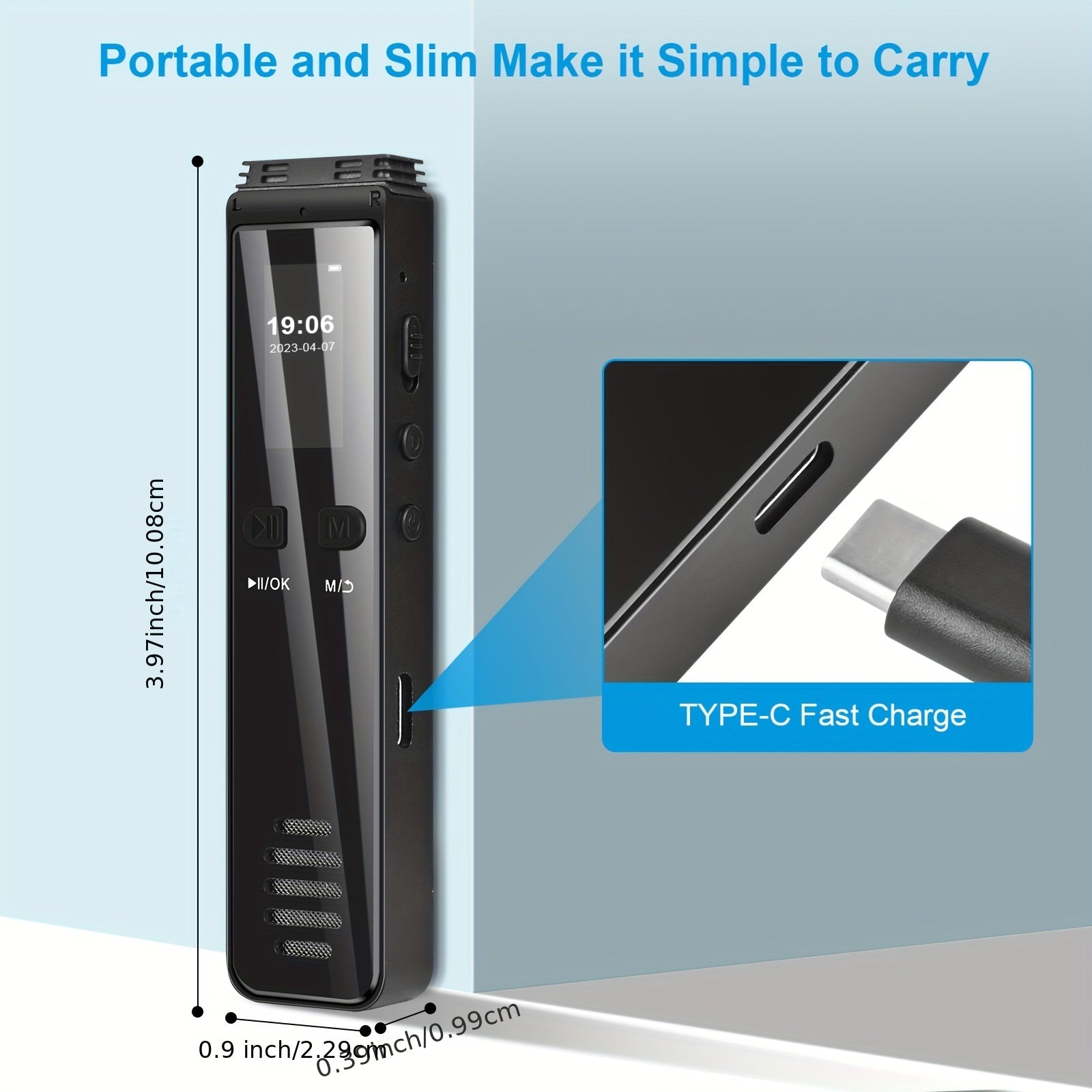 ميزة الأبعاد: 10 * 2.5 * 1.2 سم الوزن: 58 جرام تنسيق التسجيل: WAV تسجيل BT: دعم هاتف Android و iPhone تنسيق الموسيقى: MP3 ، WAV ، WMA ، OGG ، FLAC ، APE وقت التسجيل: 512 كيلو بت في الثانية 32 جيجابايت: حوالي 144 ساعة مدة التسجيل التي يمكن للبطارية تحملها: تسجيل مستمر لمدة 30 ساعة تقريبًا بسرعة 512 كيلو بت في الثانية معدل بت التسجيل: 512 كيلوبت في الثانية ، 1536 كيلوبت في الثانية ، 3072 كيلوبت في الثانية معدل أخذ العينات: 16 كيلو هرتز 48 كيلو هرتز التردد: 20-20 كيلو هرتز الميكروفون: ميكروفون متعدد الاتجاهات سعة البطارية: 375 مللي أمبير